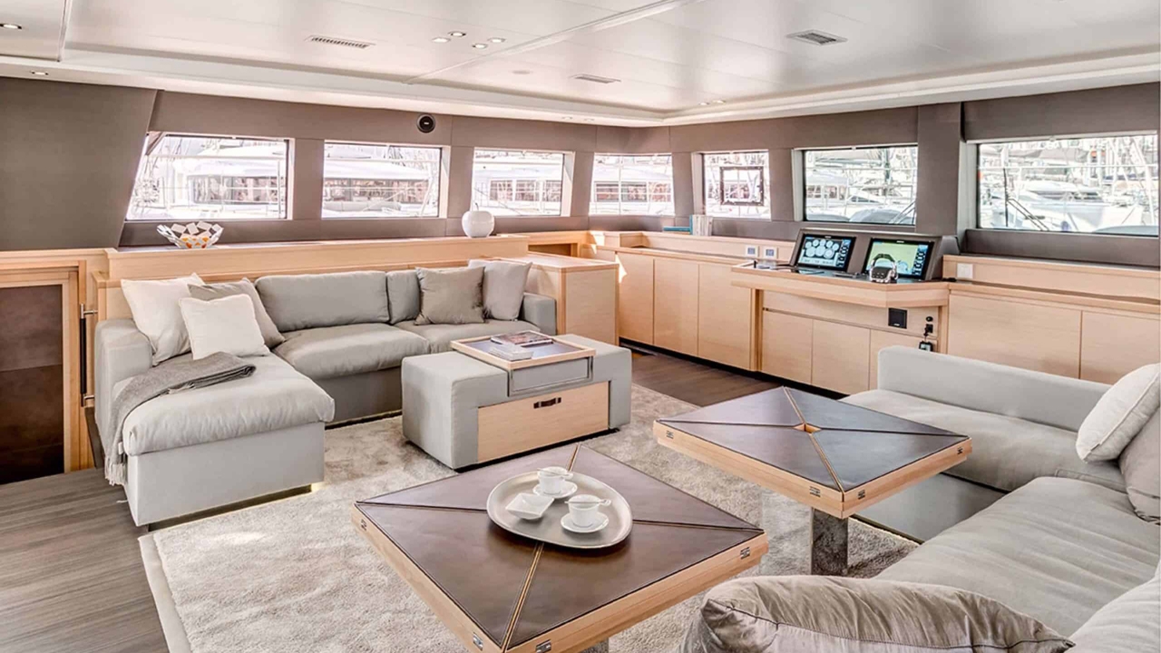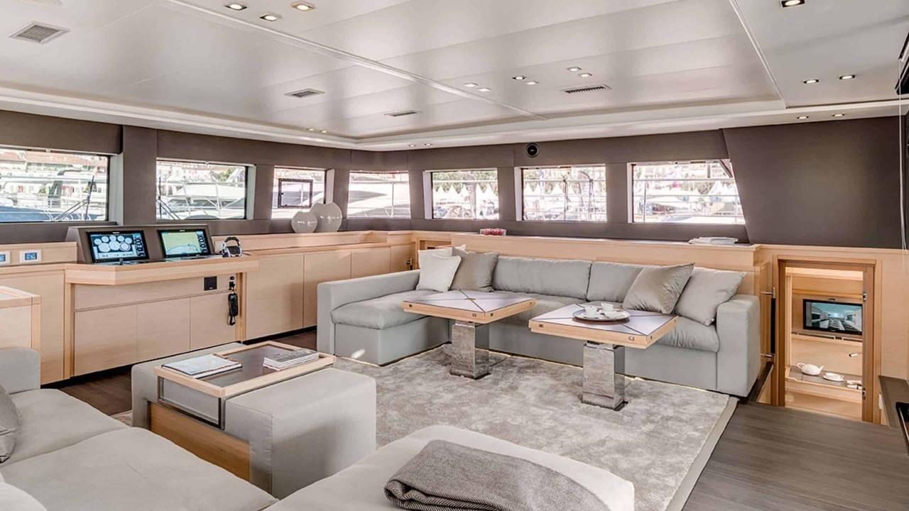 On board the roomy and comfortable catamaran you’ll find a full-equipped central galley. There’s also a spacious cockpit, an elevator platform, several sunbaths and two large trampolines at the front. On the flybridge there are helm stations, a solarium and a deck lounge with a bar.