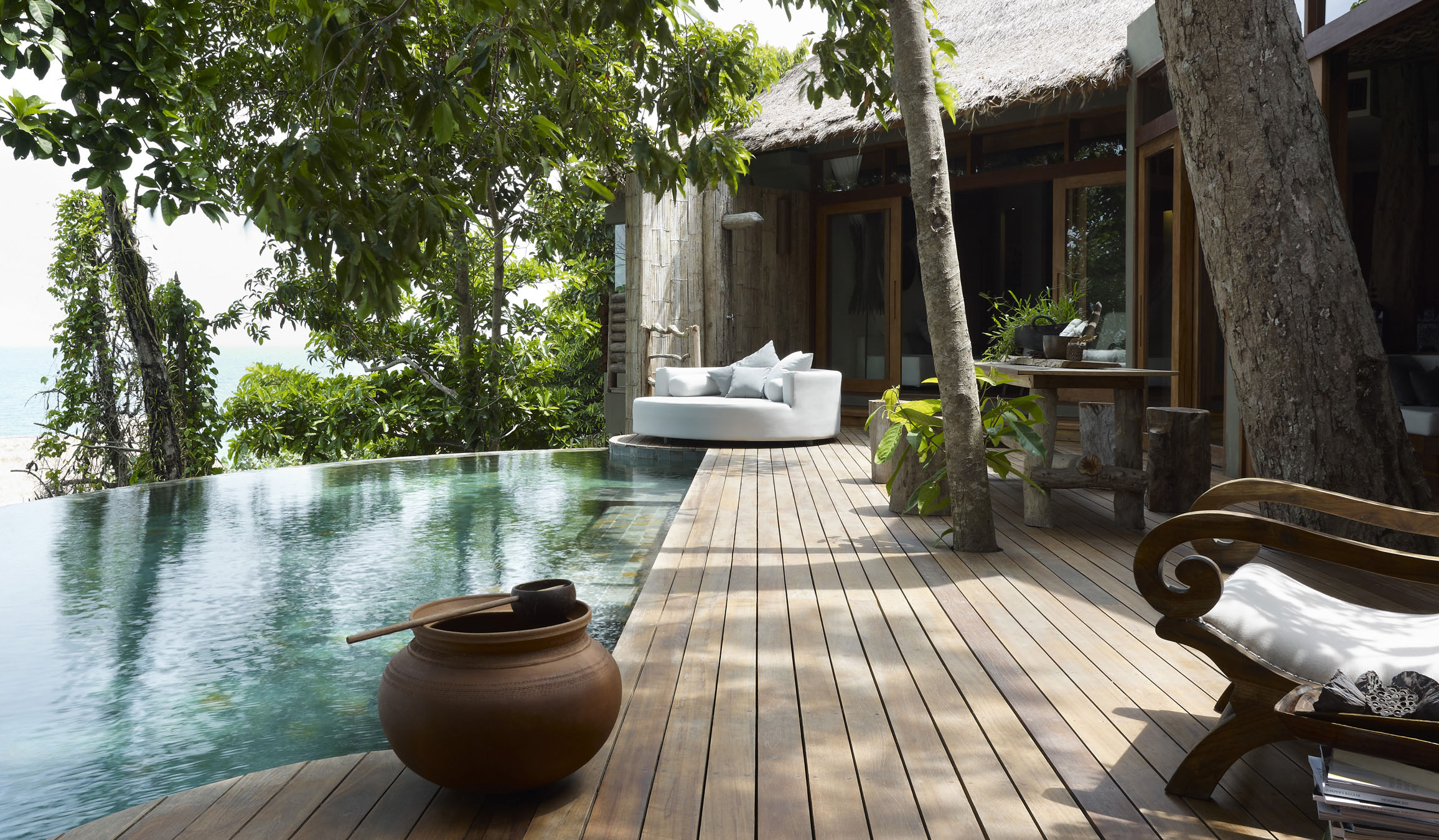 For example, all of the floors in the villas are old recycled housing materials from Thailand and Cambodia. The pool tiles are a local stone from the mainland. All the work stations are made from 100-year-old Cambodian beds.