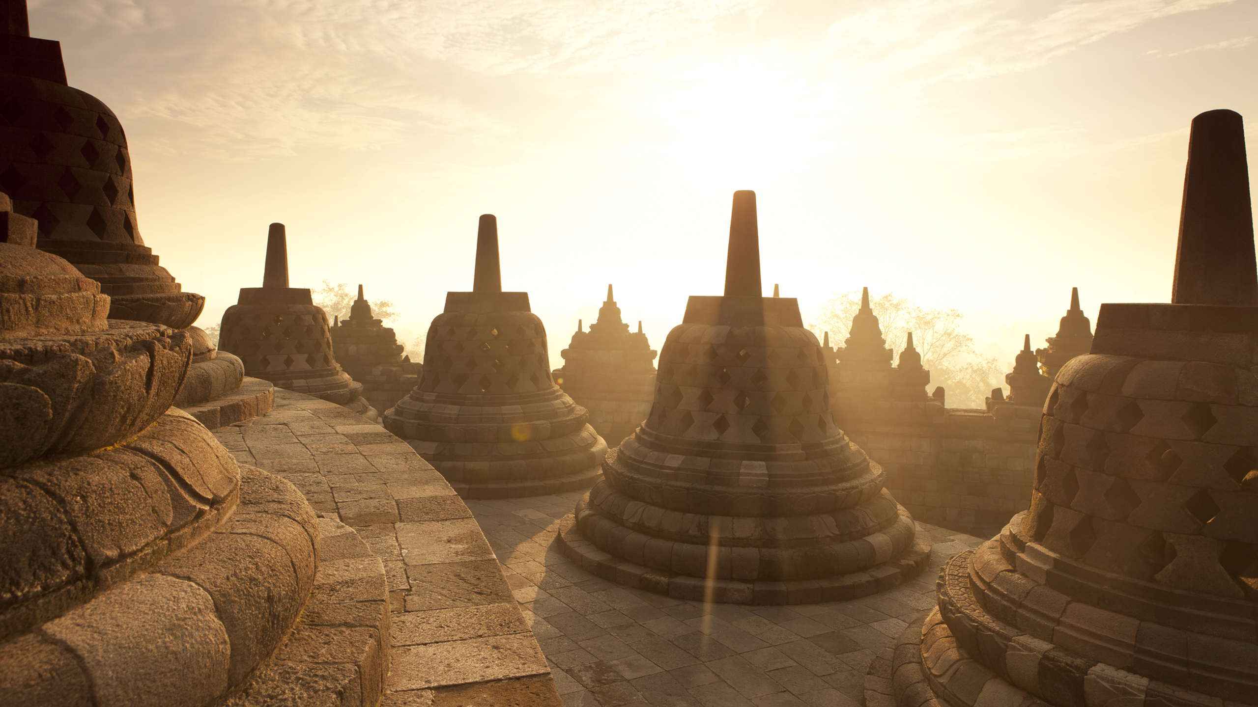 Overlooking central Java’s dramatic landscape of mist-filled valleys, lush forests, and towering volcanic peaks, the incredible temple of Borobudur perches on a hilltop, a pyramid structure adorned with 72 bell-like stupas that each house a statue of the Buddha. Dating back to the 8th and 9th centuries, this ancient temple is one of the most awe-inspiring sights in Indonesia.