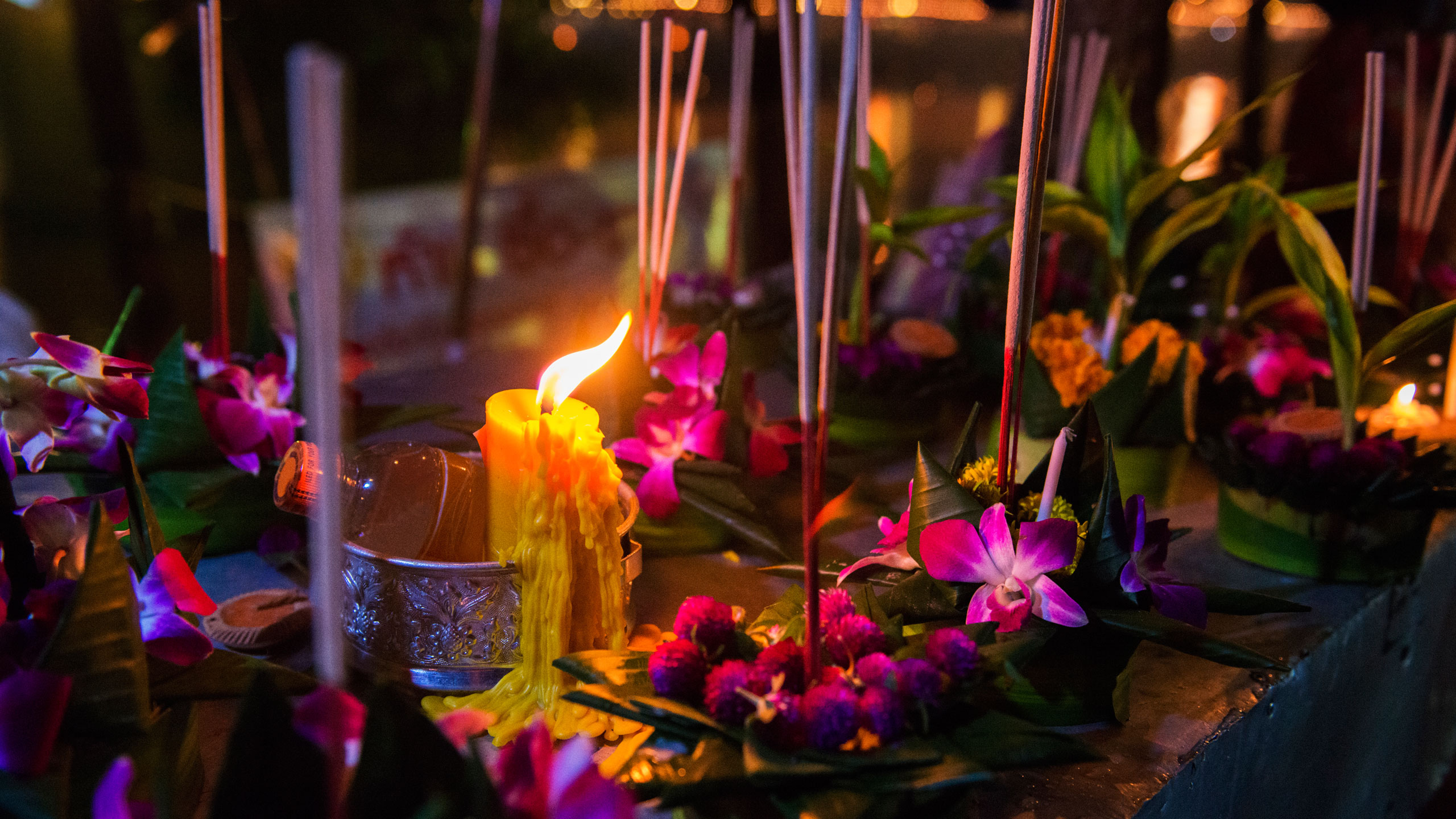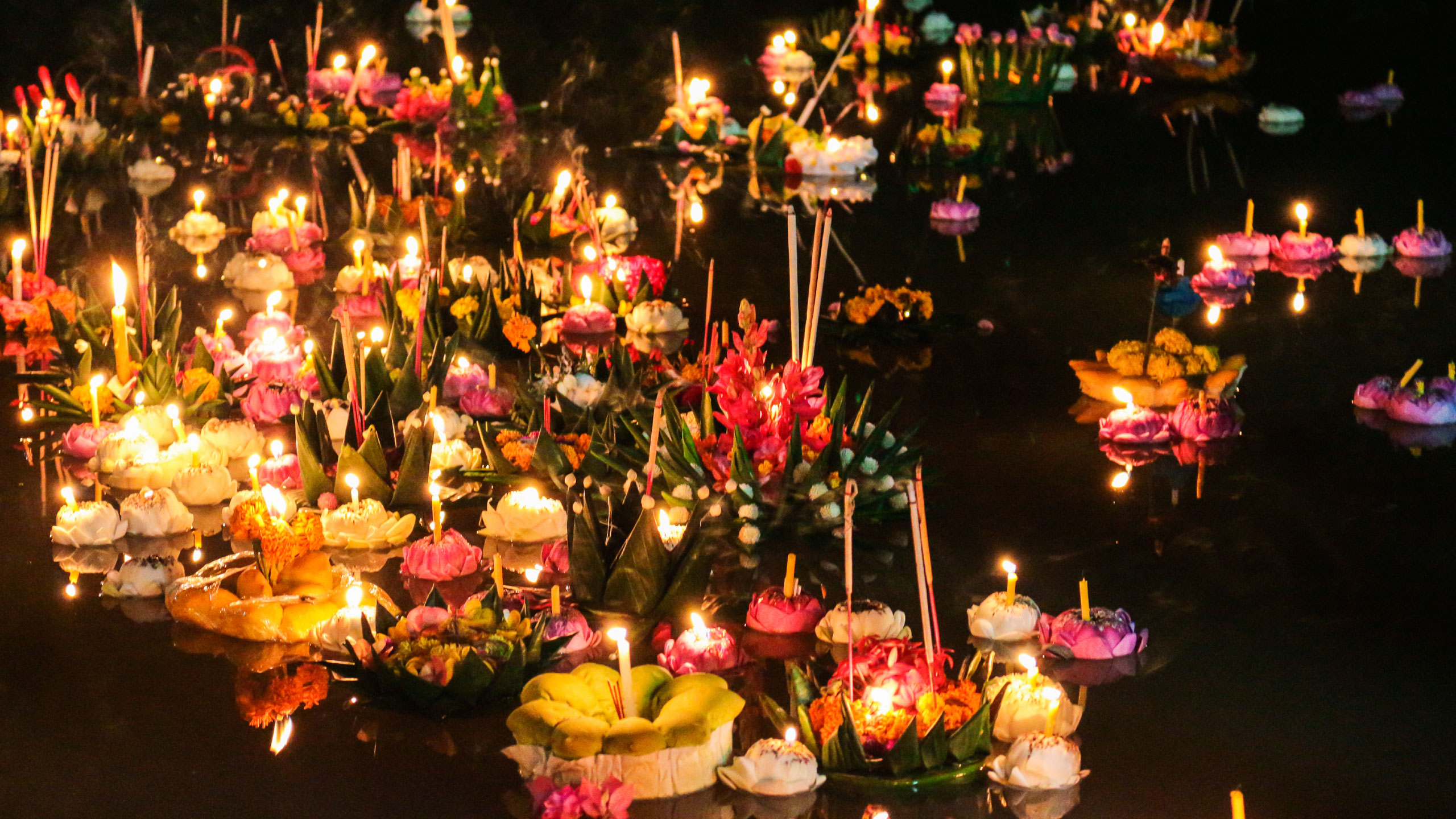 Water lanterns, also known as krathongs, are created with a base made of either the trunk of a banana tree or baked bread (which locals claim is better as it provides food for the fish). The bases are then covered with green leaves and adorned with flowers and garlands. A candle and incense stick are placed in the middle and lit before the lantern is launched into the water.