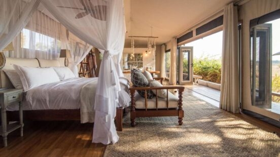 After returning from a game drive or walking safari, you can relax in your luxury canvas tent with sweeping views of the savannah, then head to the elegant dining space. Set under a verdant tree canopy, it’s the perfect place to indulge in a cocktail and gourmet cuisine.