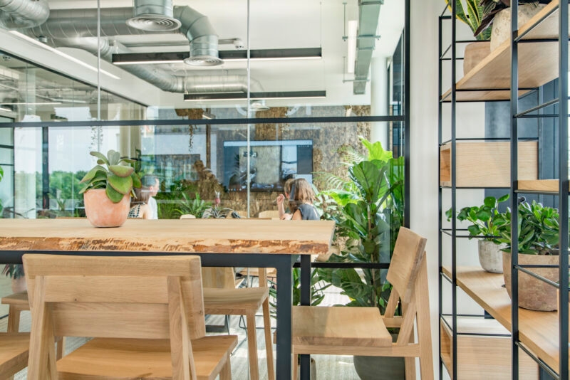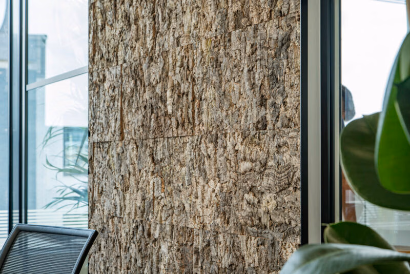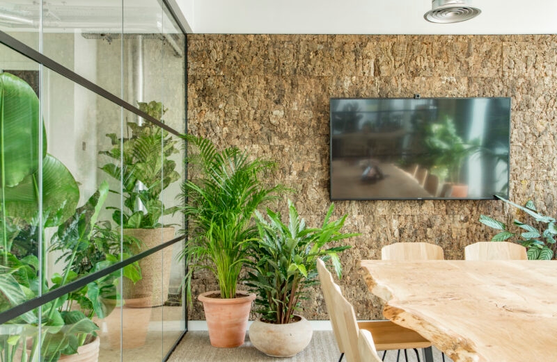 Peeled from trees in the Mediterranean, sustainable and natural cork material adorns the boards and walkways. Natural fibre carpets without traces of harmful plastic and chemical are underfoot. The blinds are made from plastic recovered from the Mediterranean Sea, and the meeting booths are made from reconstituted nettles. Lastly, the lush green plants, a defining feature of the new office space, are preened weekly by garden specialists.