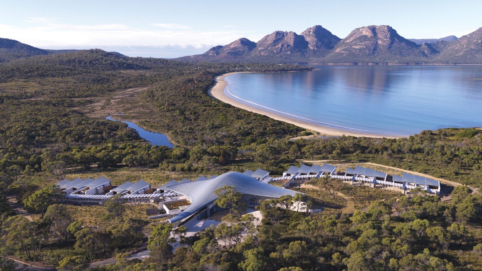 Inspired by its surroundings in spectacular Tasmania, the architecture of Saffire Freycinet echoes the colours, waves, sea creatures and sand dunes of the peninsula. The spacious, luxury suites feature Tasmanian timbers and designer touches, with views out across the bay.